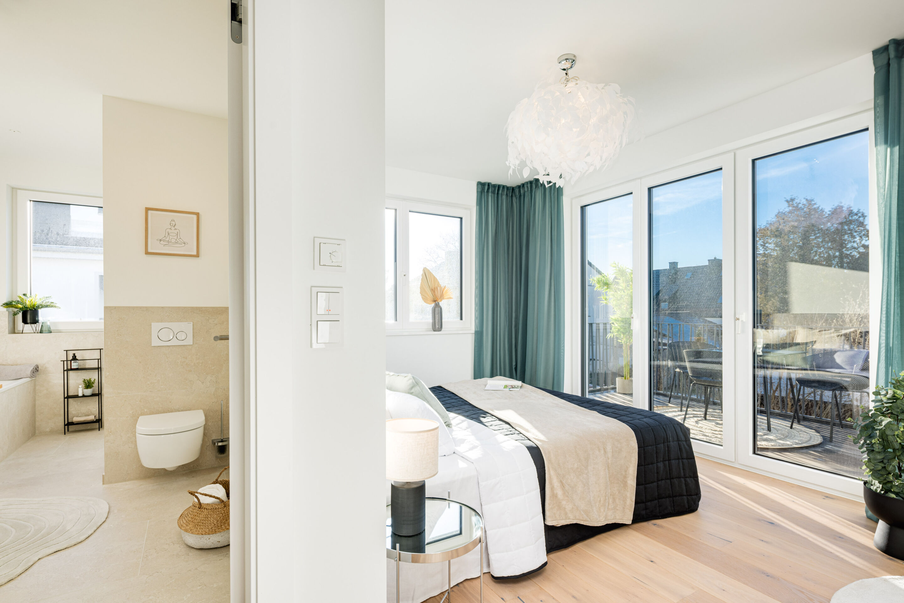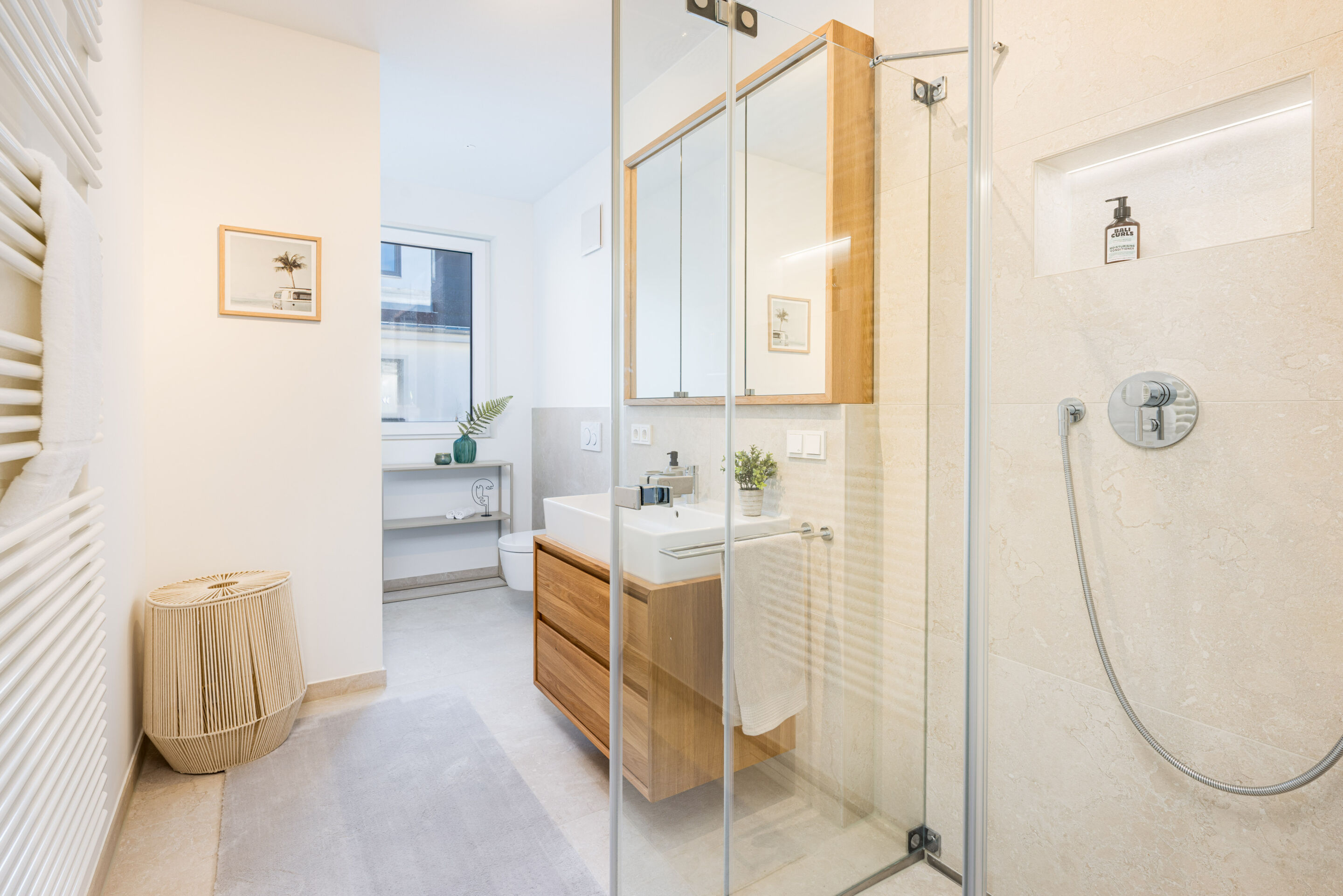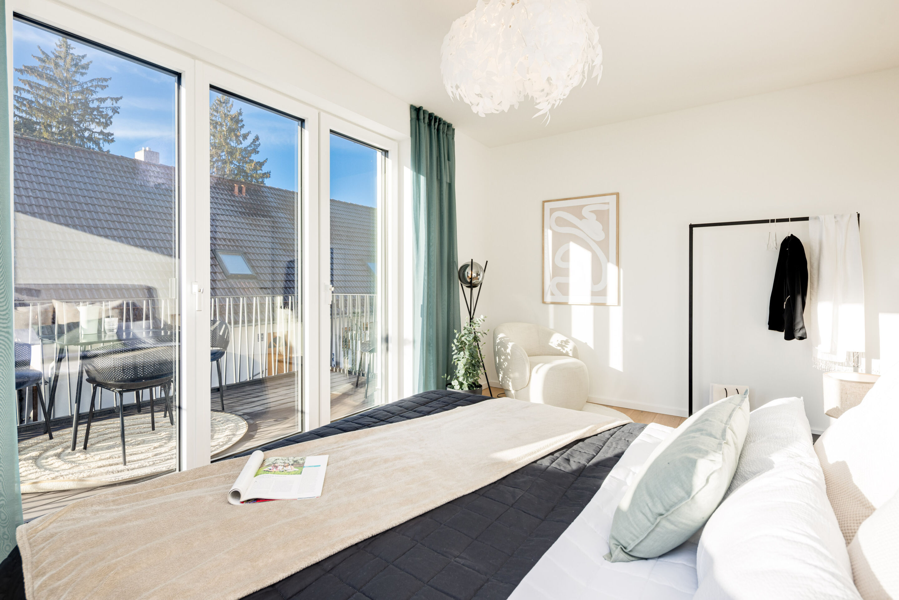 The terrace and loggia of the two attic apartments in buildings 1 and 2 are optimally south-facing and offer sun all day long. Air conditioning ensures pleasant temperatures even on hot summer days. These apartments are the ideal retreat – perfect for arriving and feeling at home.