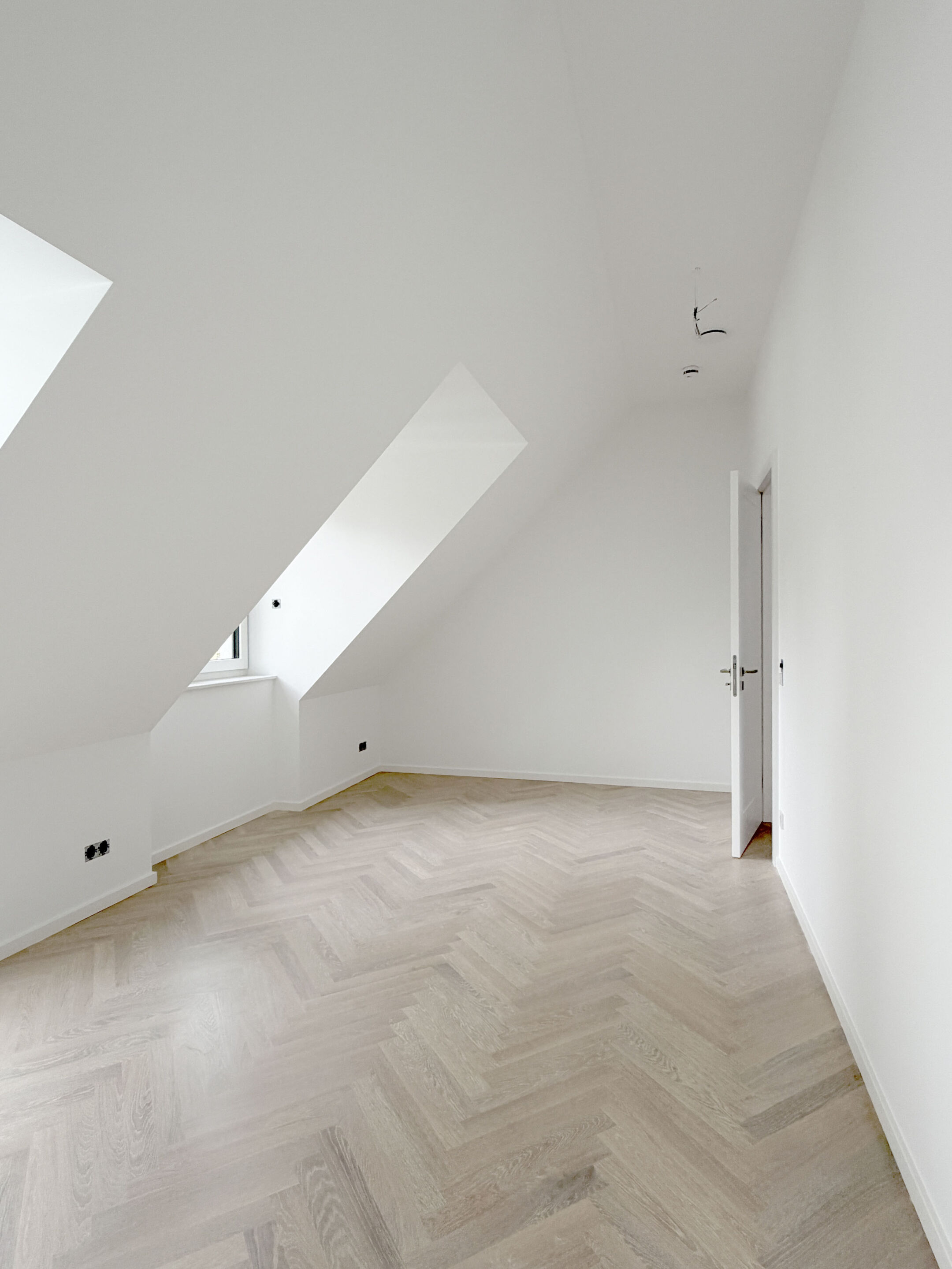- high-quality solid parquet in oak, laid in a herringbone pattern, including white skirting boards